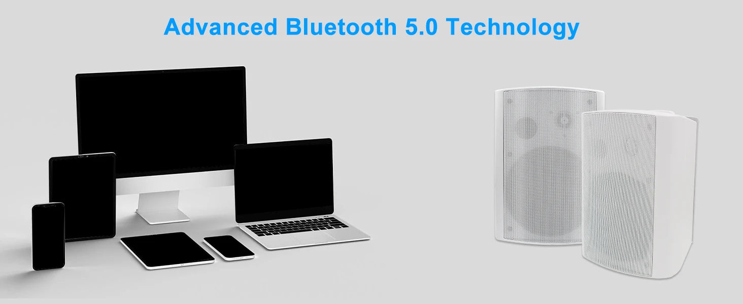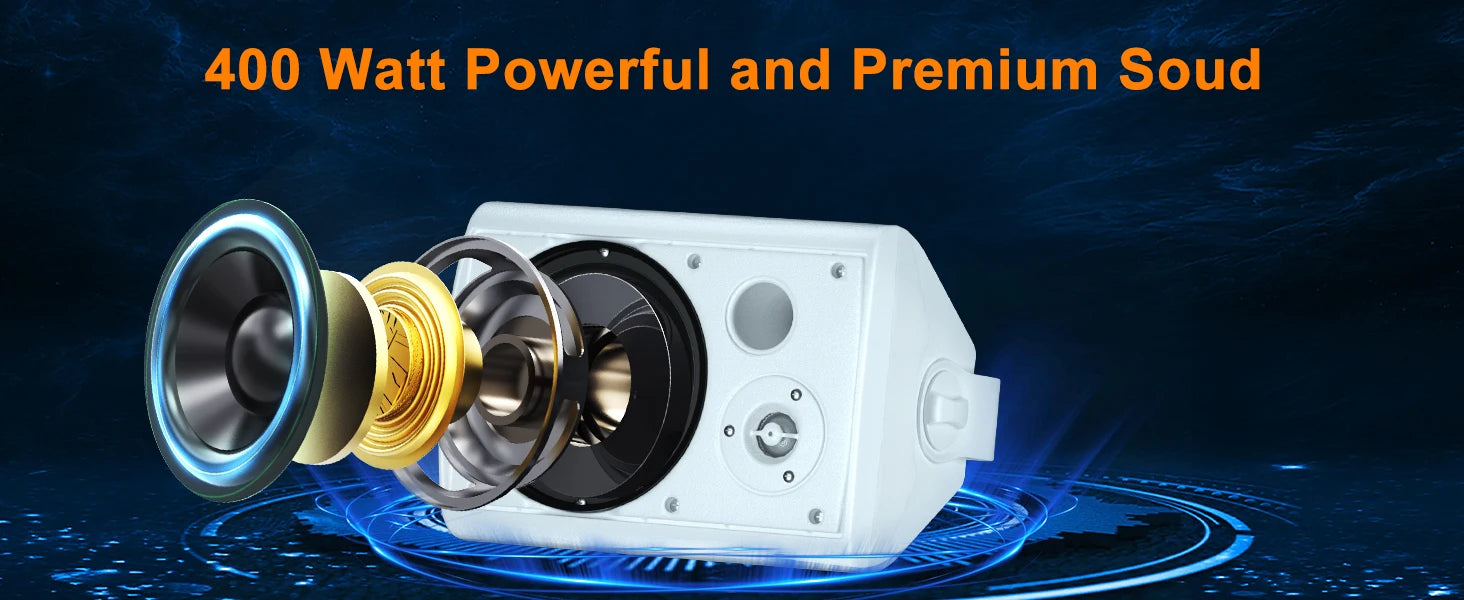 【Premium Sound Performance】Max 400w output power and the latest state-of-the-art 2 drivers (Tweeter: 1.0'' PET Dome Woofer: 6.5'' Injection Molded PP Cone Buty Rubber Surround) producing punchy and deep bass. With our outdoor speakers bluetooth, you' ll feel as if you' re at a live concert, with clear high notes, deep bass and true HD sound.