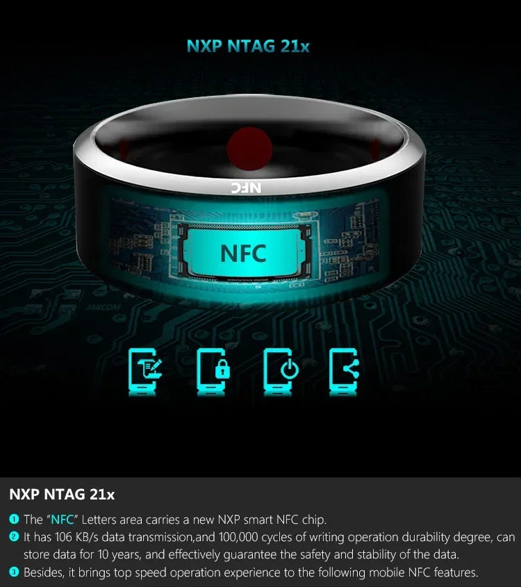 Multi-functional NFC smart ring, the main function is to store and exchange personal information, as well as mobile content and personal privacy encryption unlock.