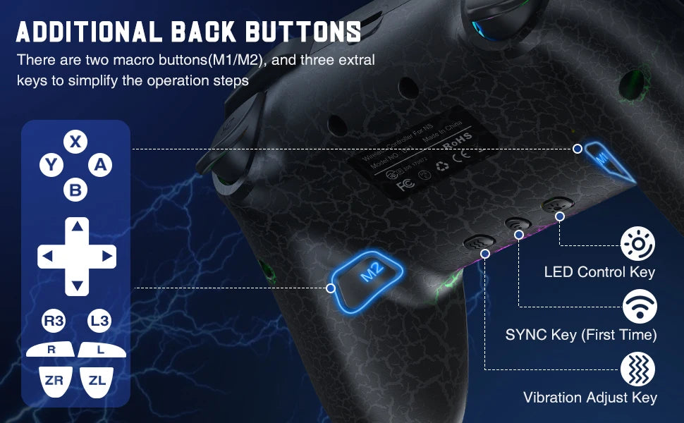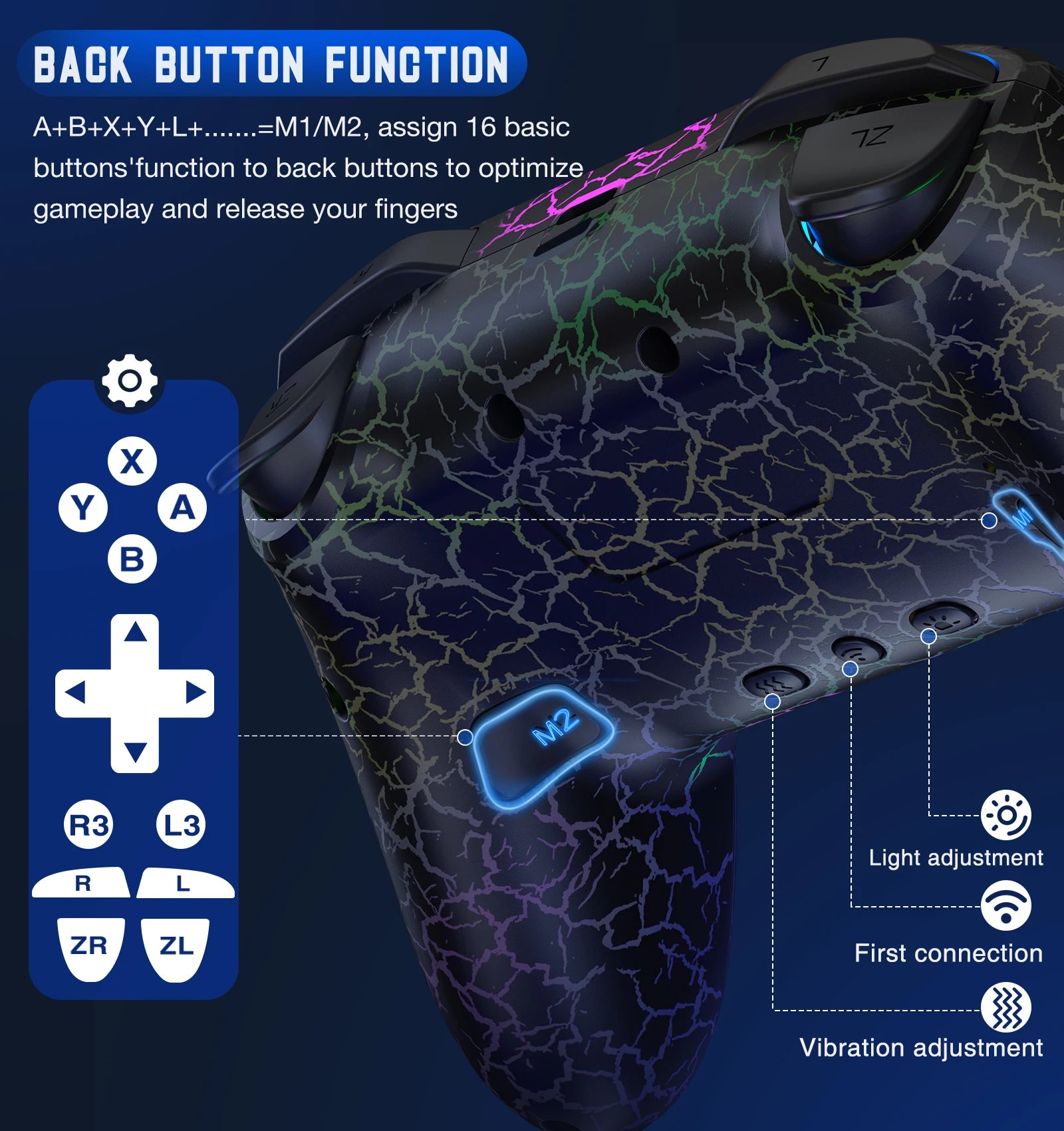 The two programming keys on the back can map basic function keys (A/B/X/Y/L/ZL/R/ZR/L3/R3/Up/Down/Left/Right). Each back key can program 1-16 basic function keys.