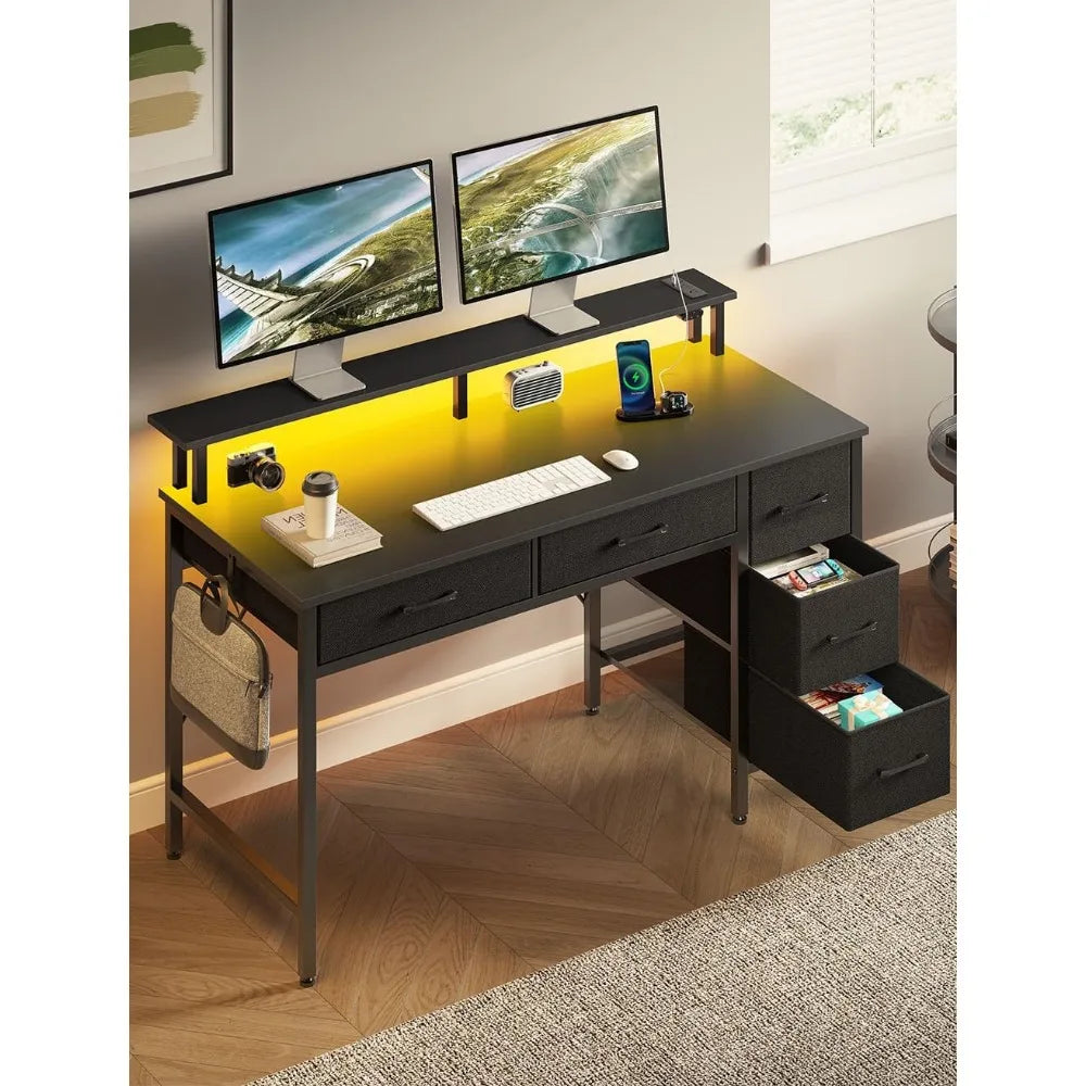 - Transform Your Workspace: Upgrade the way you work with this all-in-one computer desk. With five spacious fabric drawers and a monitor stand, you can store essentials and elevate your screen to reduce neck and back strain. The desktop is large enough for a laptop and books, making it easy to multitask and stay organized. Each drawer can support up to 8 lbs, giving you plenty of room for all your work essentials