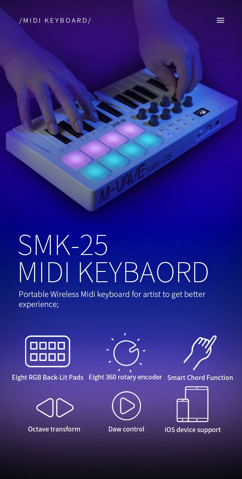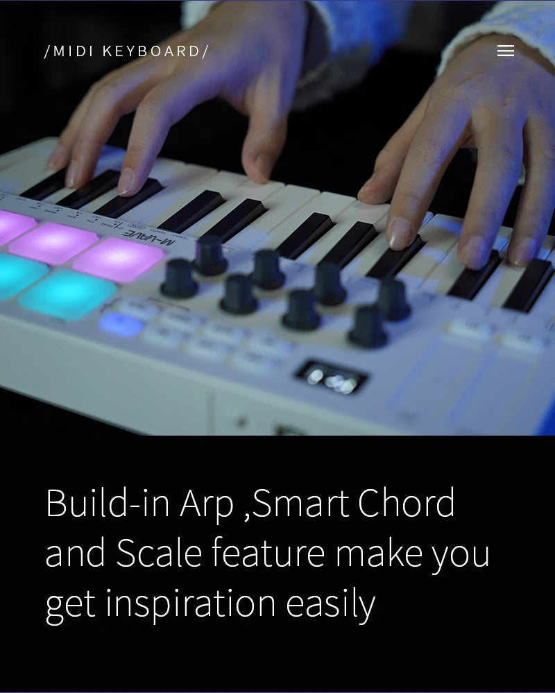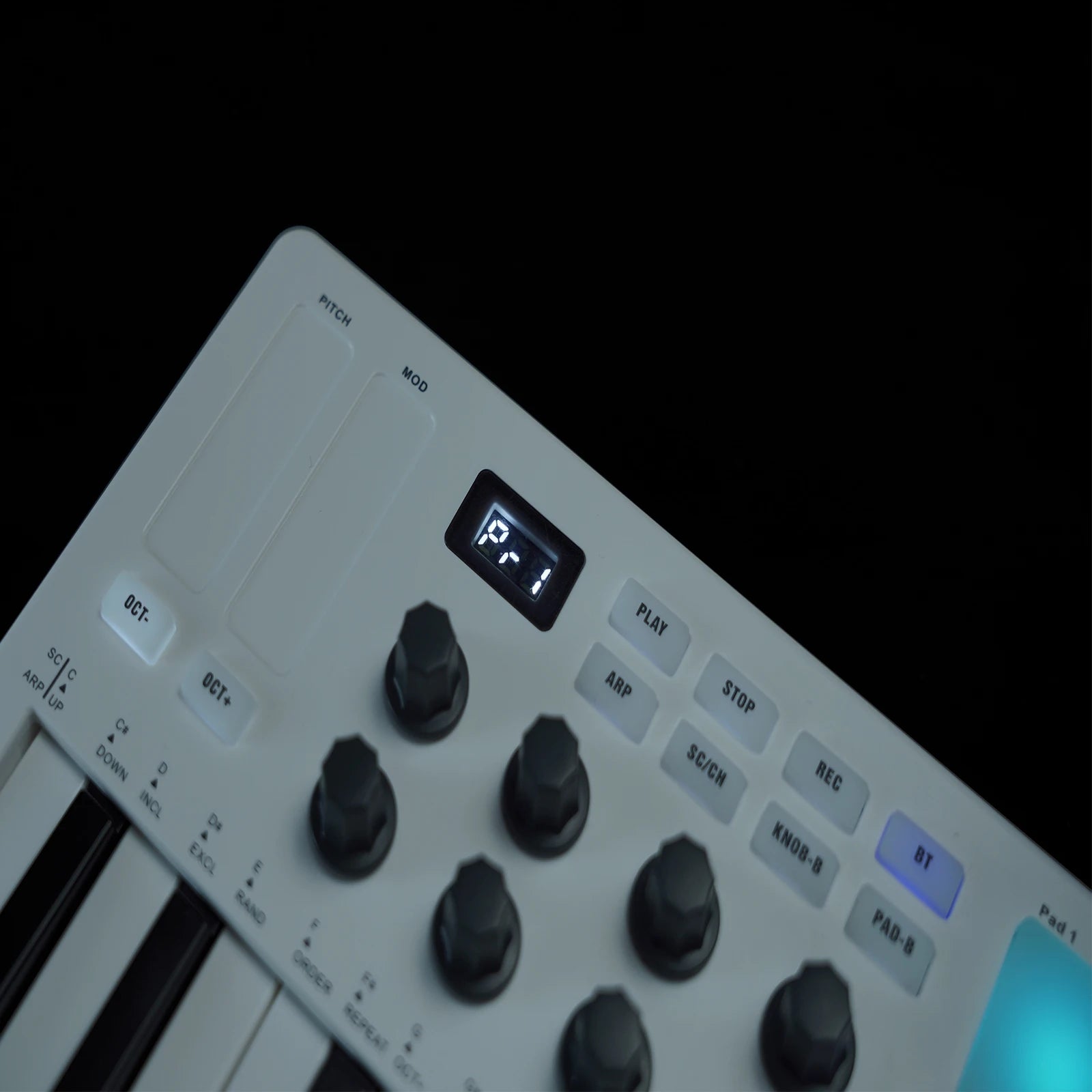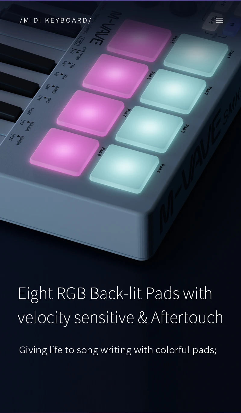 8 RGB back-lit pads with velocity-sensitive & aftertouch.