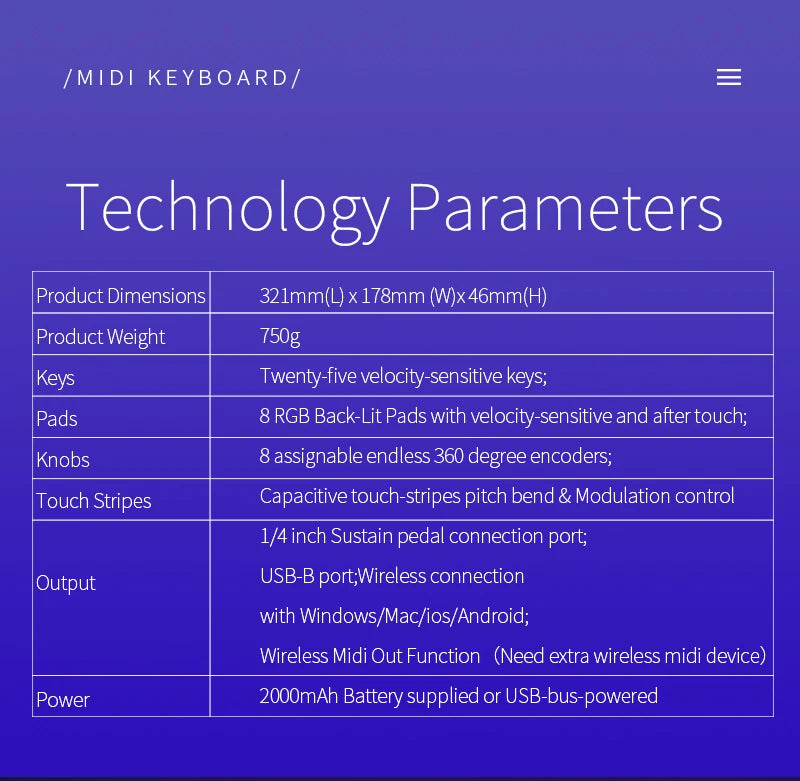 Pads: 8 RGB back-lit pads with velocity-sensitive & aftertouch