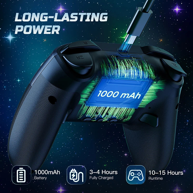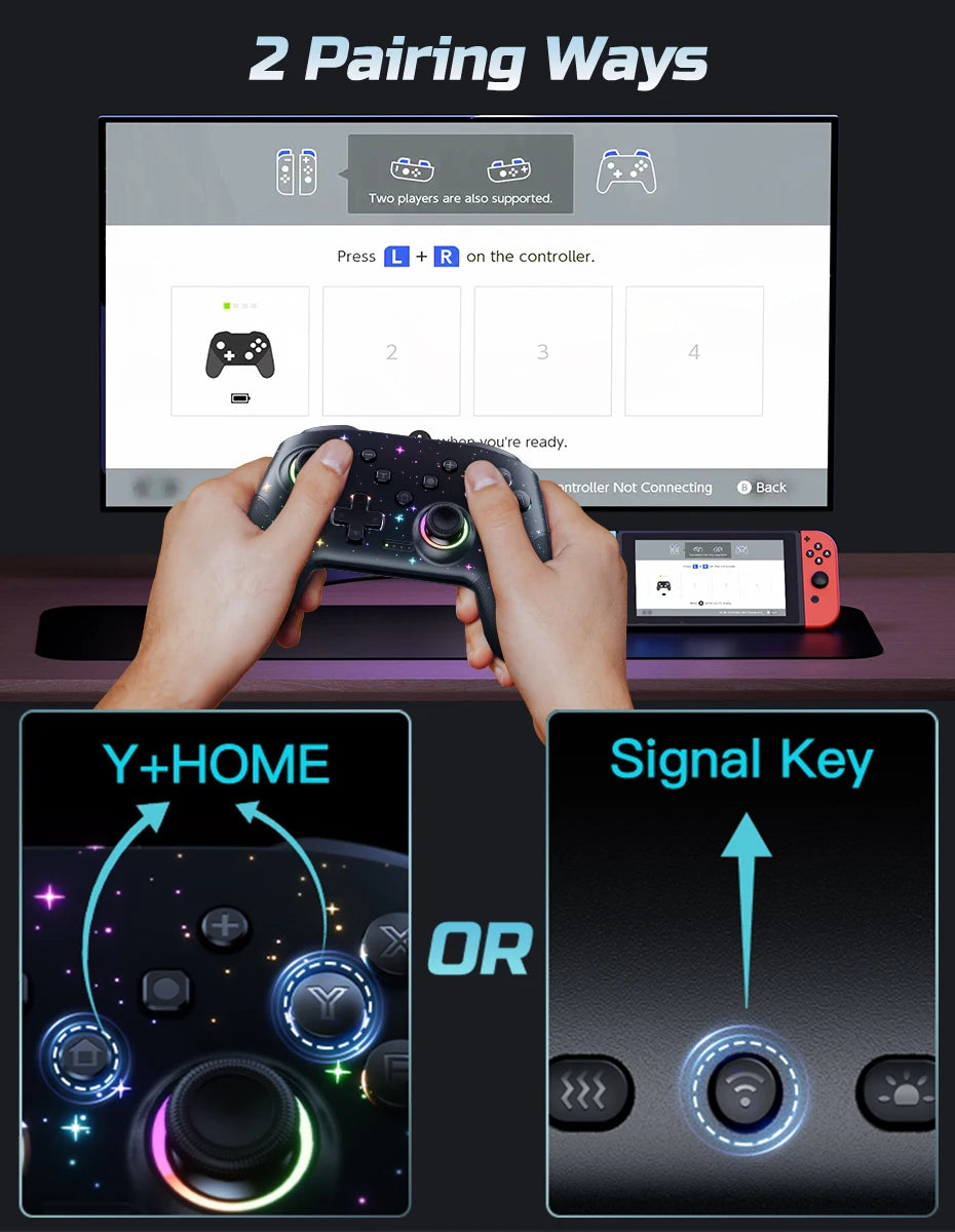 Runtime: 10-15H, Fully charged: 3-4H; Switch controller is compatible with Switch/Lite/OLED/iOS/Android/PC Windows 7/8/10/11. No input lag, no dropped signals. The pro controller switch is easy to pair quickly by 2 ways: โ Press the pairing key on the back โกPress Y and HOME buttons for 3s. To save the battery from depleting, it goes into sleep mode if not used after 20mins. Just touch the HOME button to wake it up