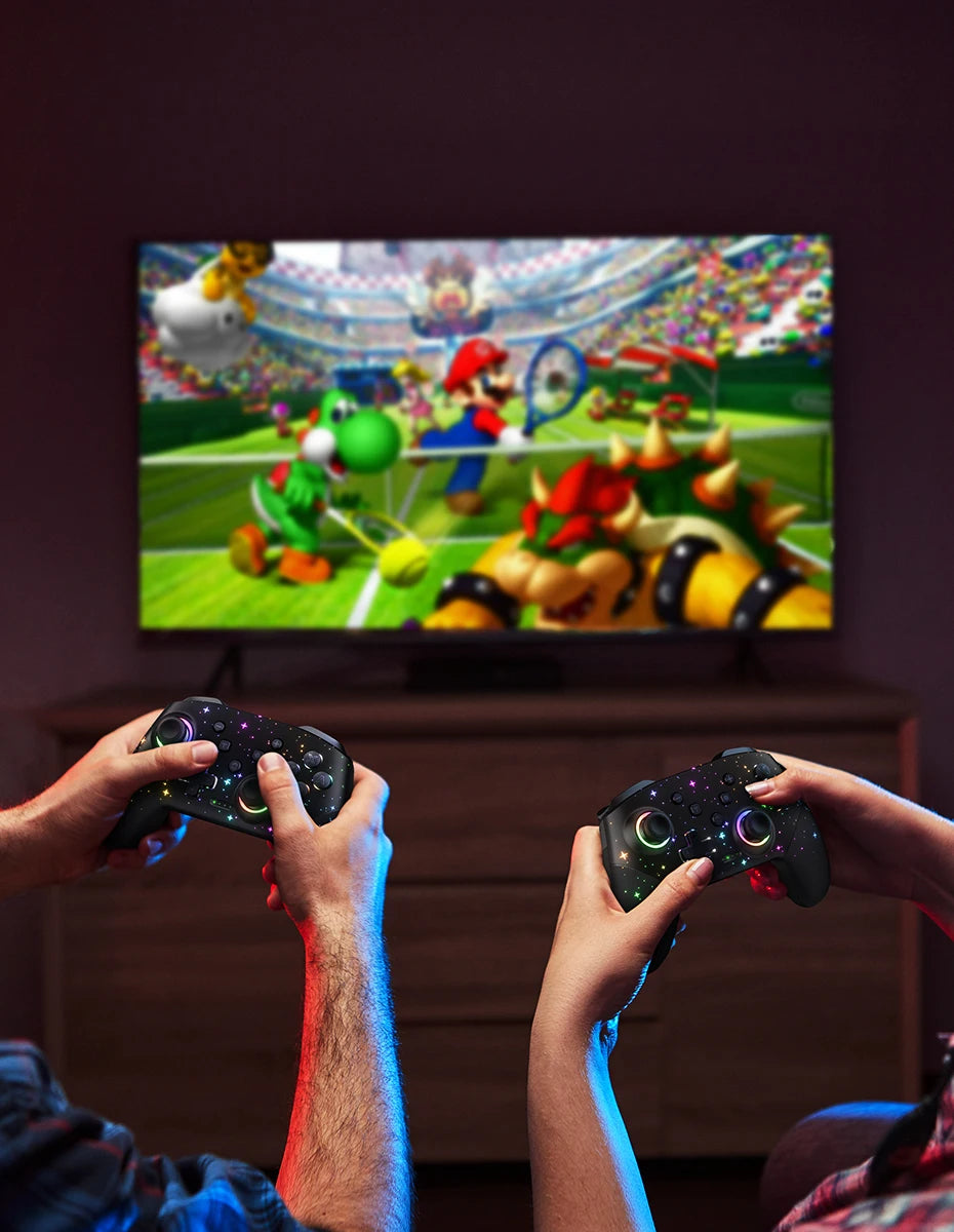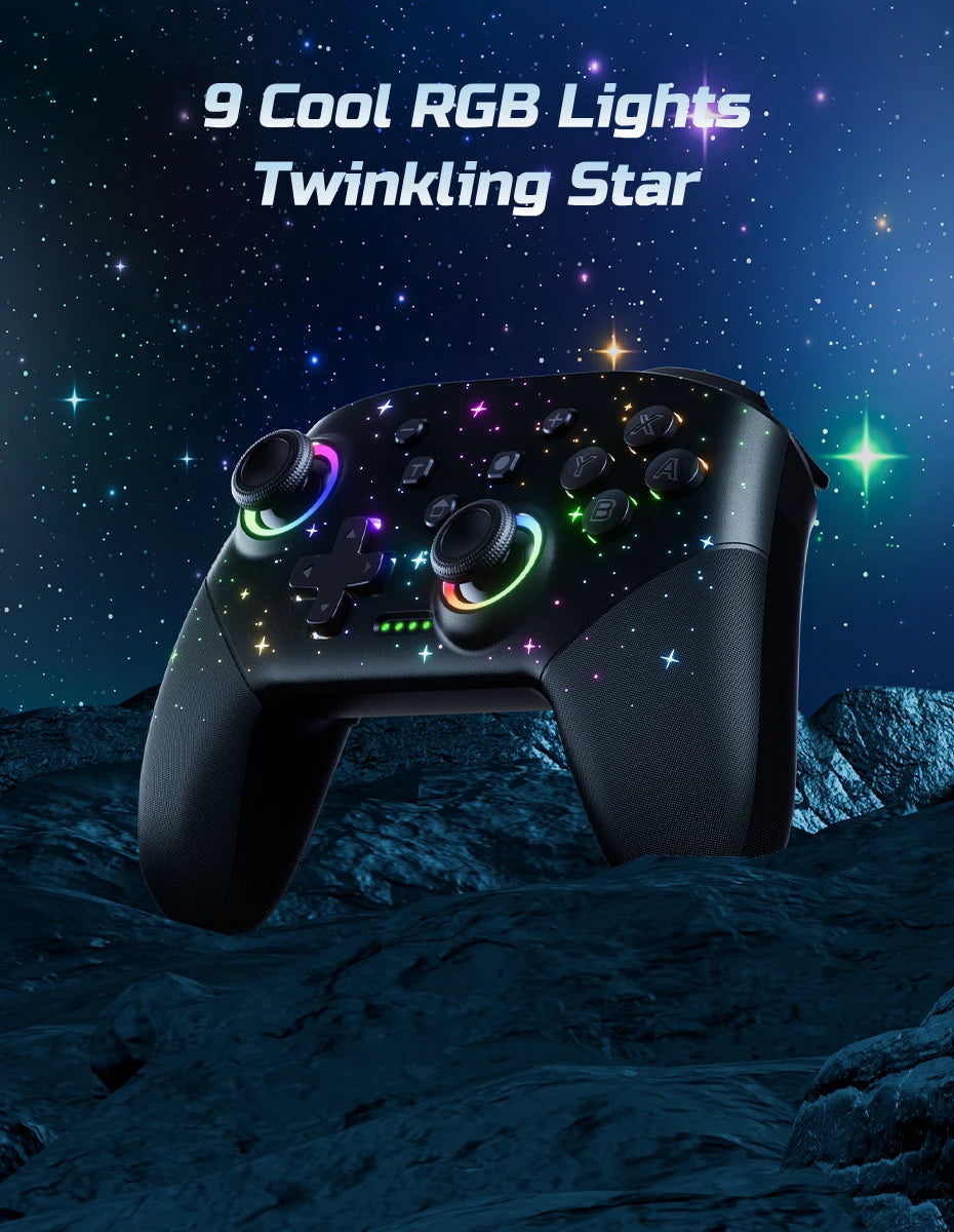 You could control the light mode of the switch controllers: twinkling stars, single-color stars glowing, slow breathing stars, strobe light and led off. The stars lites up and looks cool in a dimly lit room while gaming. The switch pro controller is well made, feels sturdy and has a nice matte finish with a great grip. Lightweight and fits comfortably in your hands for long play times (No NFC, Not for Amiibos)