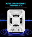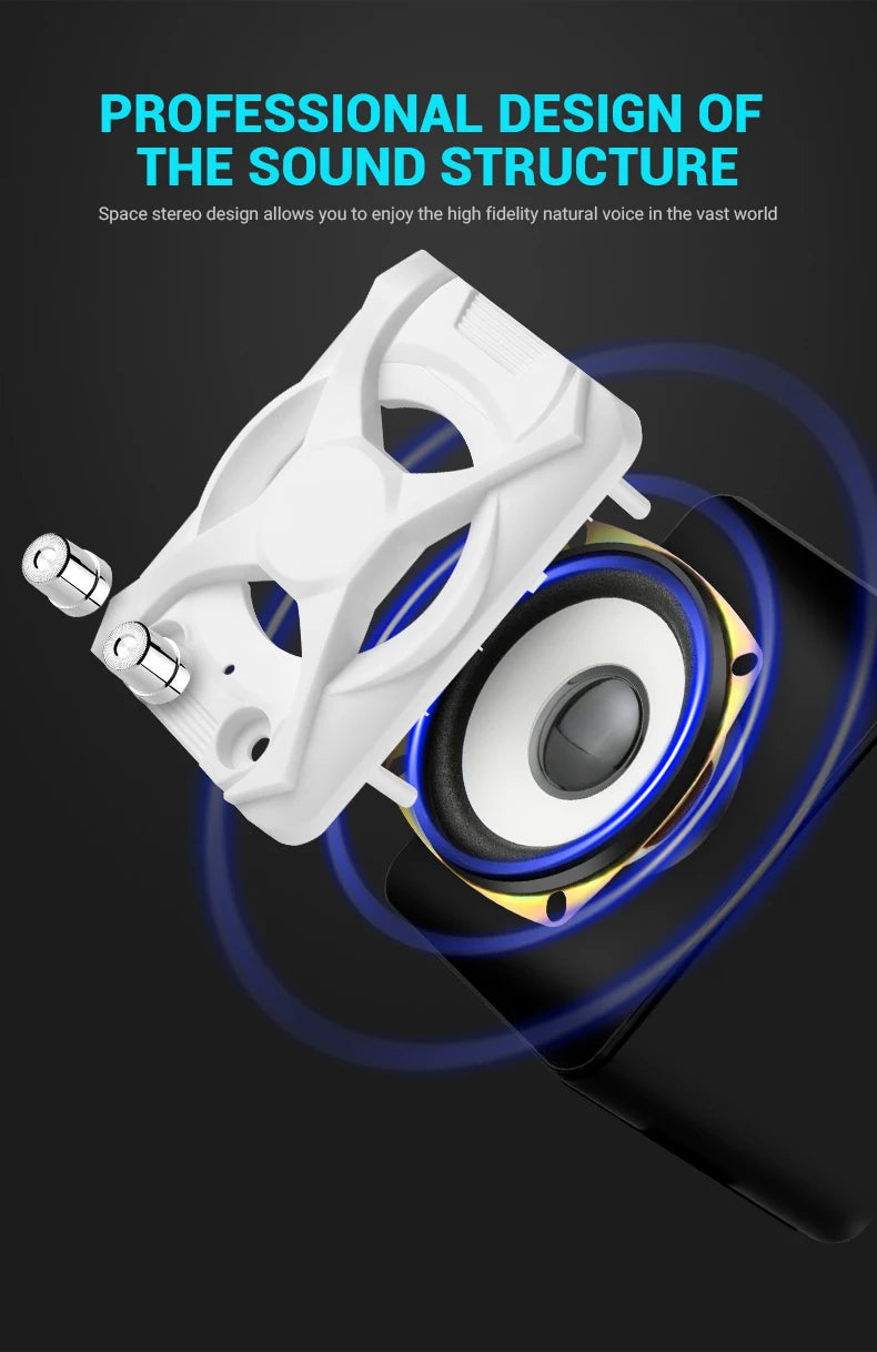 1.Compatible with most system devices: Only need a USB port to charge, the speaker compatible with all 3.5mm audio interface devices, such as desktop computers, laptops, mobile phones, MP3, MP4, etc. 2.Professionally designed acoustic cavity structure: Space stereo sound design allows you to enjoy high fidelity sound. 3.360° increase to the ground: Playing music is, the bass booster constantly vibrates downwards, the low frequency sounds through the desktop, and the 360° spreads around. 4.Bass boost technology: Audio Circuit Technology + Physical Acoustic Pressure Resonance Design; Small speakers also provide amazing bass and powerful stereo. 5.Powerful and amazing stereo sound: Full-range high-fidelity dual speakers,reproduce live sound