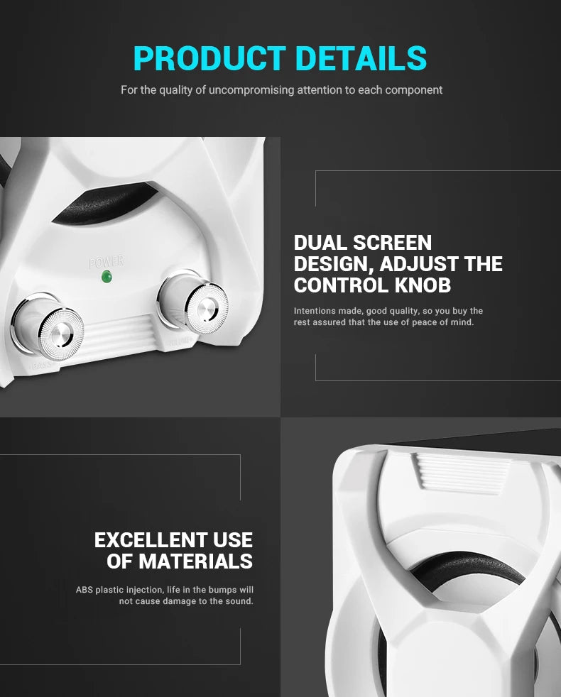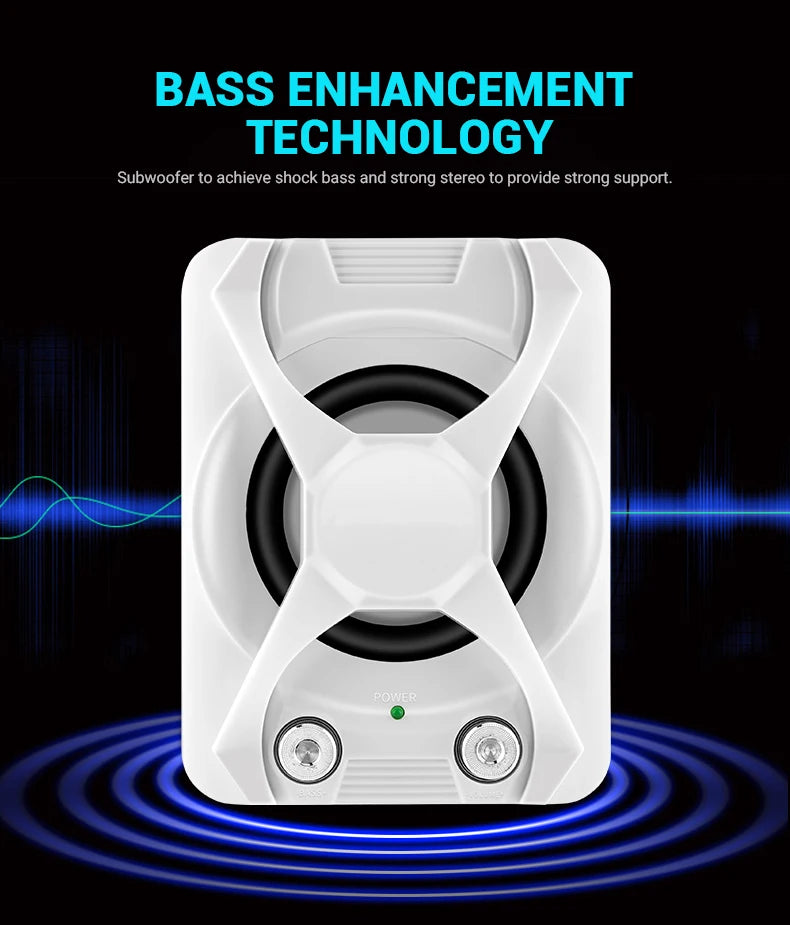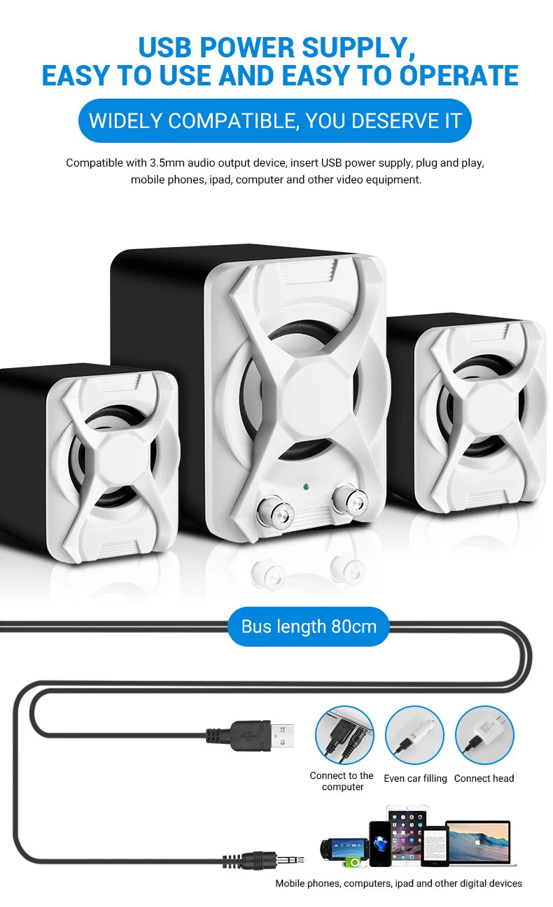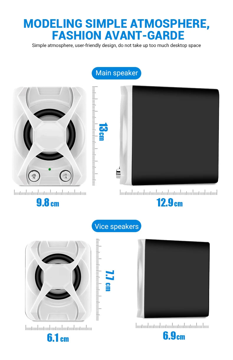 1.High quality wire: High-conductivity copper core wire to prevent poor contact, improve wear and corrosion resistance, and more stable. 2.Volume + Bass adjustment: Roller-controlled volume adjustment, convenient and easy to use. 3.2 x 4Ω 3W + 5W bass high quality horns: The sound is mellow and the sound quality is clear and shocked. 4.Superior materials: ABS injection molding material,bumping will not damage the speaker. 5.Simple design, easy to install and use: Two speakers can be placed separately 80cm,cable length 80cm.